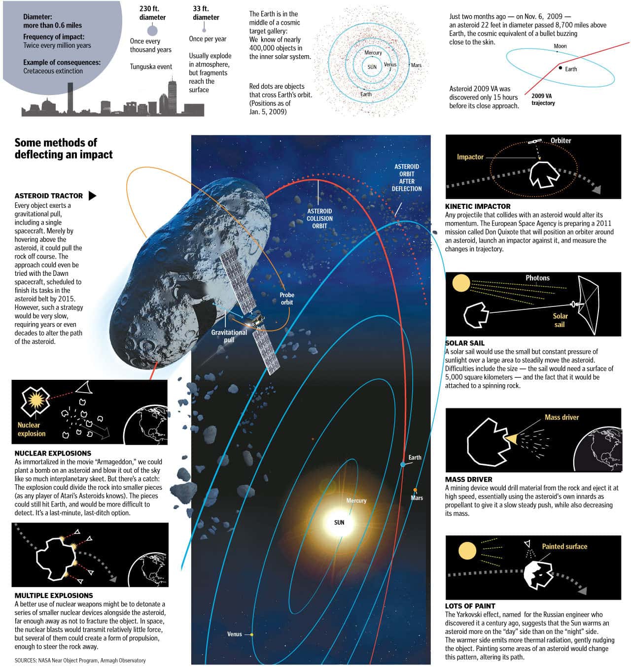 Mas a criação de um sistema para defletir asteróides é debatida no meio científico há muito tempo. Alguns especialistas propuseram enviar uma sonda para circundar um asteróide perigoso e gradualmente modificar sua trajetória. Outros sugeriram enviar uma nave espacial para colidir com o asteróide e alterar o seu momentum, ou ainda empregar armas nucleares.